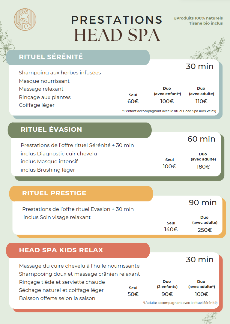 Head Spa (Soin Signature) : Une expérience immersive combinant massages du cuir chevelu, soins profonds et rituels relaxants (Rituels Sérénité, Évasion ou Prestige).