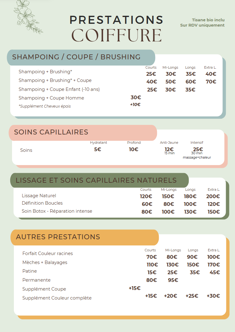 Coiffure et Soins Capillaires : Des services allant de la coupe au brushing, en passant par des lissages naturels et des soins botox, tous réalisés avec des produits naturels.